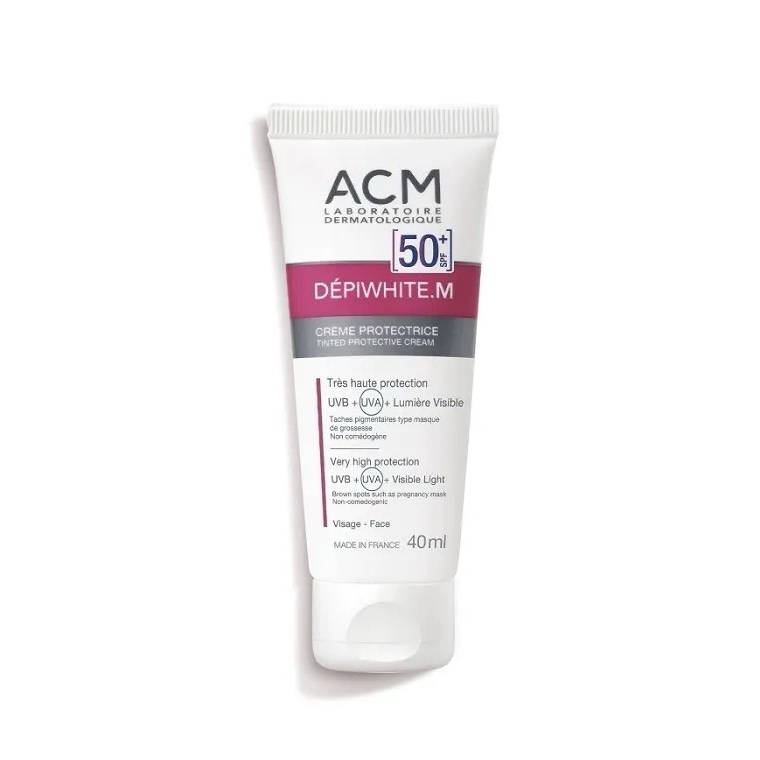 La crème solaire visage SPF 50+ Dépiwhite.M dispose d’une formule dont l’association des filtres solaires ont été brevetés par le Laboratoire ACM. Elle permet de protéger la peau du visage des taches pigmentaires localisées et étendues, provenant de l’exposition aux UVA et aux UVB. Elle offre aussi une protection complémentaire contre la lumière visible (bleue), pouvant jouer un rôle actif dans l’aggravation du masque de grossesse.