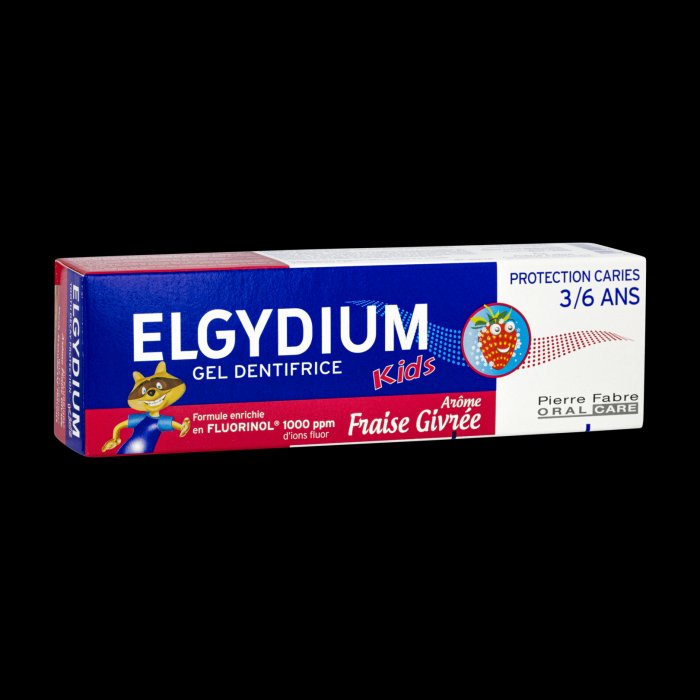 ELGYDIUM dentifrice Kids (3/6 ans) Fraise givrée, une protection des dents de lait contre les caries et un goût qui plaît aux enfants. Aide à renforcer et protéger les dents grâce au Fluorinol® « Une teneur en fluor adaptée à l’âge de l’enfant. Arôme Fraise givrée. »