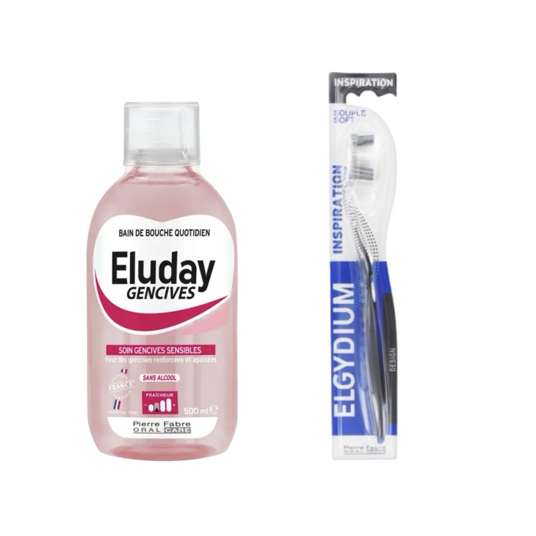 Pack Eluday Gencive Irritée Elgydium, comprenant un bain de bouche de 500 ml et une brosse à dents souple. Conçu pour apaiser les gencives irritées et offrir une protection complète.