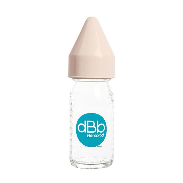 Biberon en verre pour bébé, idéal pour les jus et l’eau. Format compact avec tétine fine et coloris rose doux.