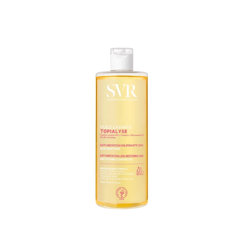 La TOPIALYSE Huile Lavante Micellaire de SVR est un soin nettoyant spécialement formulé pour les peaux sèches à très sèches, sensibles et à tendance atopique. Elle nettoie en douceur, nourrit intensément et apaise les sensations de démangeaisons, tout en préservant le film hydrolipidique de la peau.