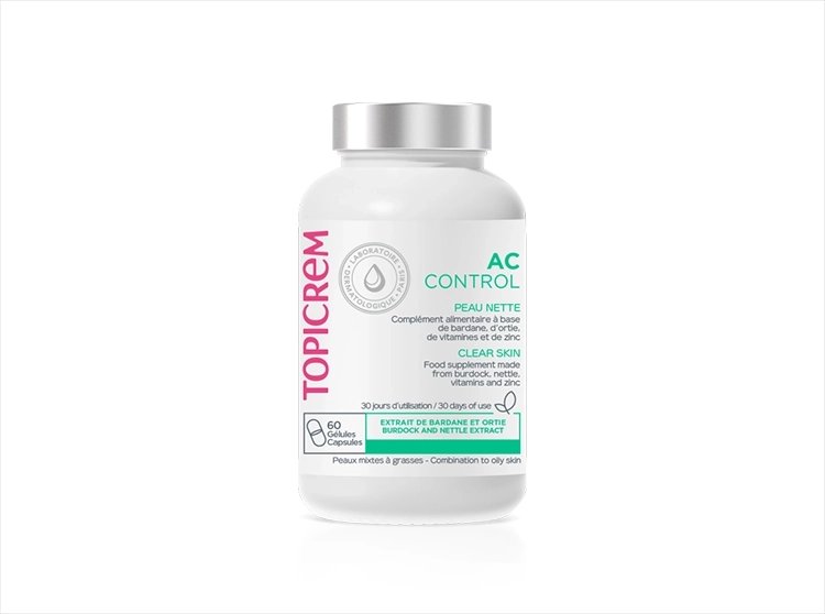 Topicrem AC Control Peau Nette 60 Gélules est un complément alimentaire à base de bardane, d’ortie, de vitamines et de zinc.